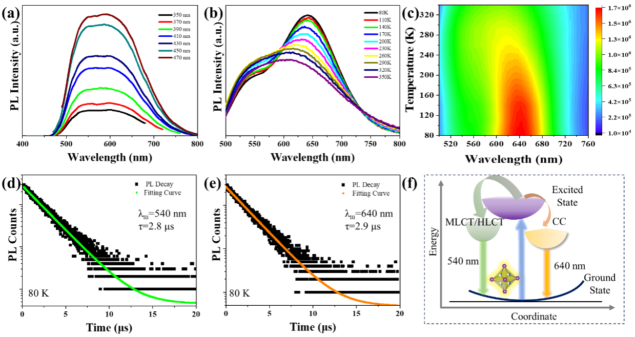 温度依赖的发射光谱表明,随着温度的降低,(C19H18P)2Cu4I6在540 nm和640 nm (80 K)处显示明显双峰。其发光机理为:在高能光激发下,[Cu4I6]2-多面体的电子直接从基态跃迁到激发态,形成自由激子;接着大多数自由激子弛豫到MLCT/HLCT态,从而产生高能发射带。进而,部分自由激子弛豫到相对较低的CC态,导致低能发射带的形成。