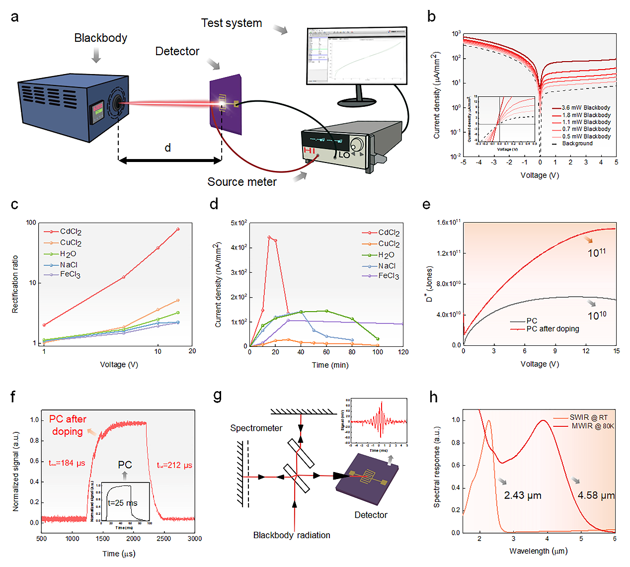 团队研究了不同离子对掺杂浓度的作用机制,如图2所示。研究发现,器件经过CdCl2溶液处理后与经过CuCl2、H2O、NaCl和FeCl3溶液处理相比表现出了最优的整流特性,其整流比是其他溶液处理后的十倍。随着电场激活时间的增加,器件在零偏压下的光电流逐渐增加达到峰值后降低。器件经过CdCl2溶液处理后的零偏压下的光电流是其他溶液处理后的四倍。此外,器件经过CdCl2溶液处理后零偏压下的光电流达到峰值所需要的电场激活时间最短。因此,器件经过CdCl2溶液处理,电场激活15分钟,器件具有最强的内建电场。与未进行电场激活掺杂的光导型器件相比,电场激活原位掺杂平面光伏型器件比探测率提高了一个数量级,超过1011Jones。此外,器件的响应速度从未电场激活掺杂的25毫秒提升到了184微秒。